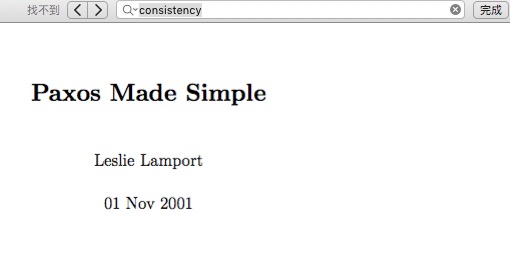 问题的由来很大一部分原因在于英文对中文的翻译,因此我们必须将术语还原到英文进行讨论,『一致性』对应的英文名词应该是 Consistency 没错了,然后我们在Lamport大神的原始论文《Paxos Made Simple》中搜索关键词,你会发现: