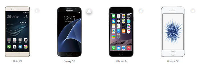 HTML结构我们分三部分,第一是产品列表部分,展示所有可以对比的产品。我们以某手机网站为例,简单的结构,只需展示产品图片和名称,以及一个添加按钮。注意我们把手机的相关参数信息都放在属性data-*里,等会后面展示对比信息的时候会用到。