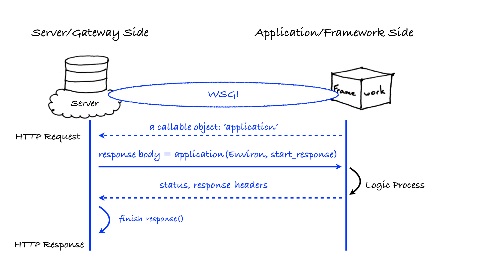 Application 具体要做的就是根据 environ 里面提供的关于 HTTP 请求的信息,进行一定的业务处理,返回一个可迭代对象,服务器端通过迭代这个对象,来获得 HTTP 响应的正文。如果没有响应正文,那么可以返回None。