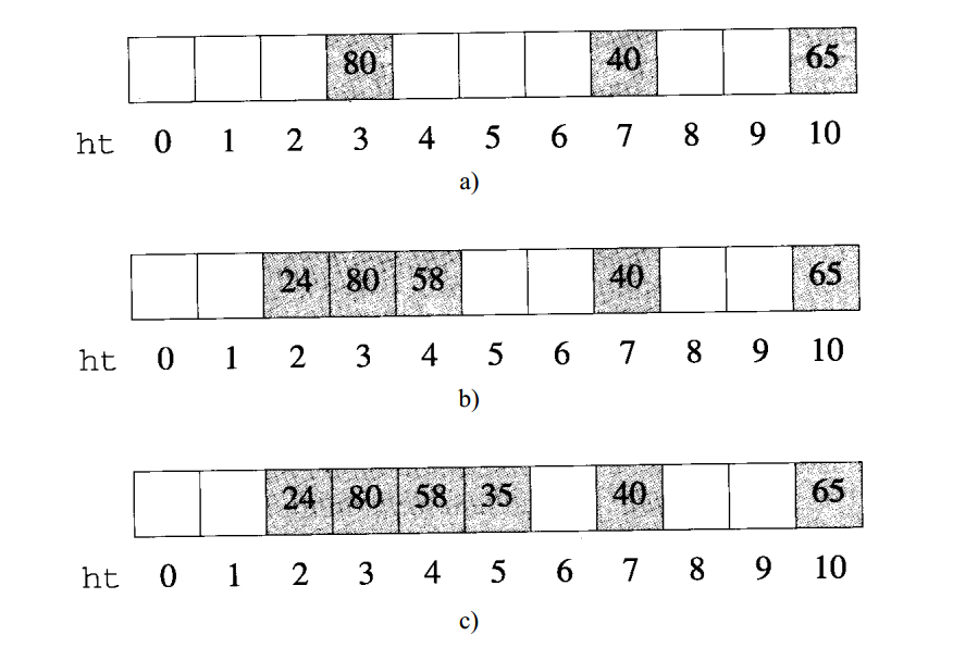 下图中给出一个散列表ht,桶号从0到10,在图a中,表中只有3个元素,除数D是11,由于80%11=3,所以80的位置是3,40%11=7,65%11=10,每个元素都在相应的桶中,散列表中余下的桶为空。
