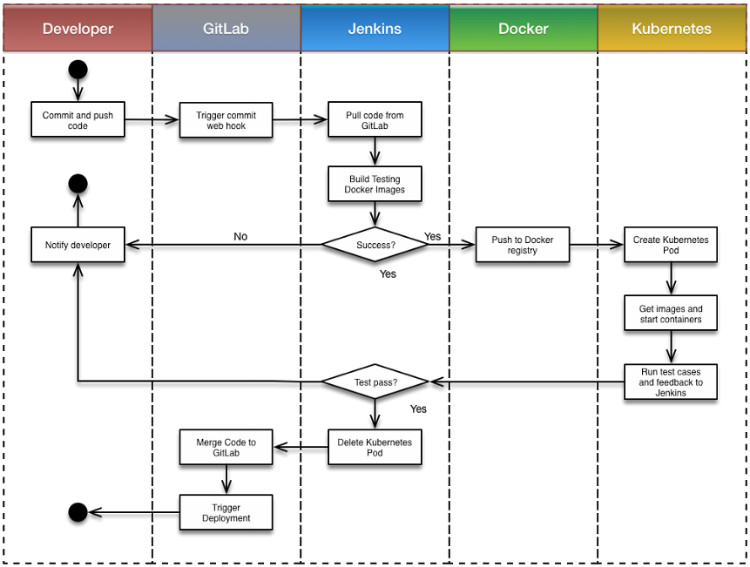 方案的工作流程如下:首先,开发人员提交代码代码提交;随后,GitLab 会自动触发Jenkins job,Jenkins job会构建相应的镜像,放在一个Kubernetes的Pod里面;接下来,Kubernetes的Pod会把模块需要的其他依赖都包含在其内部(比如MySQL、Redis、MongoDB等),运行robot测试用例,测试用例的结果最后会反馈到Jenkins中;所有测试通过之后,GitLab把代码Merge到Master分支,然后触发部署,构建生产环境所需的Docker镜像并上传到镜像仓库。最后,生产环境的Kubernetes拉取最新的镜像做更新。