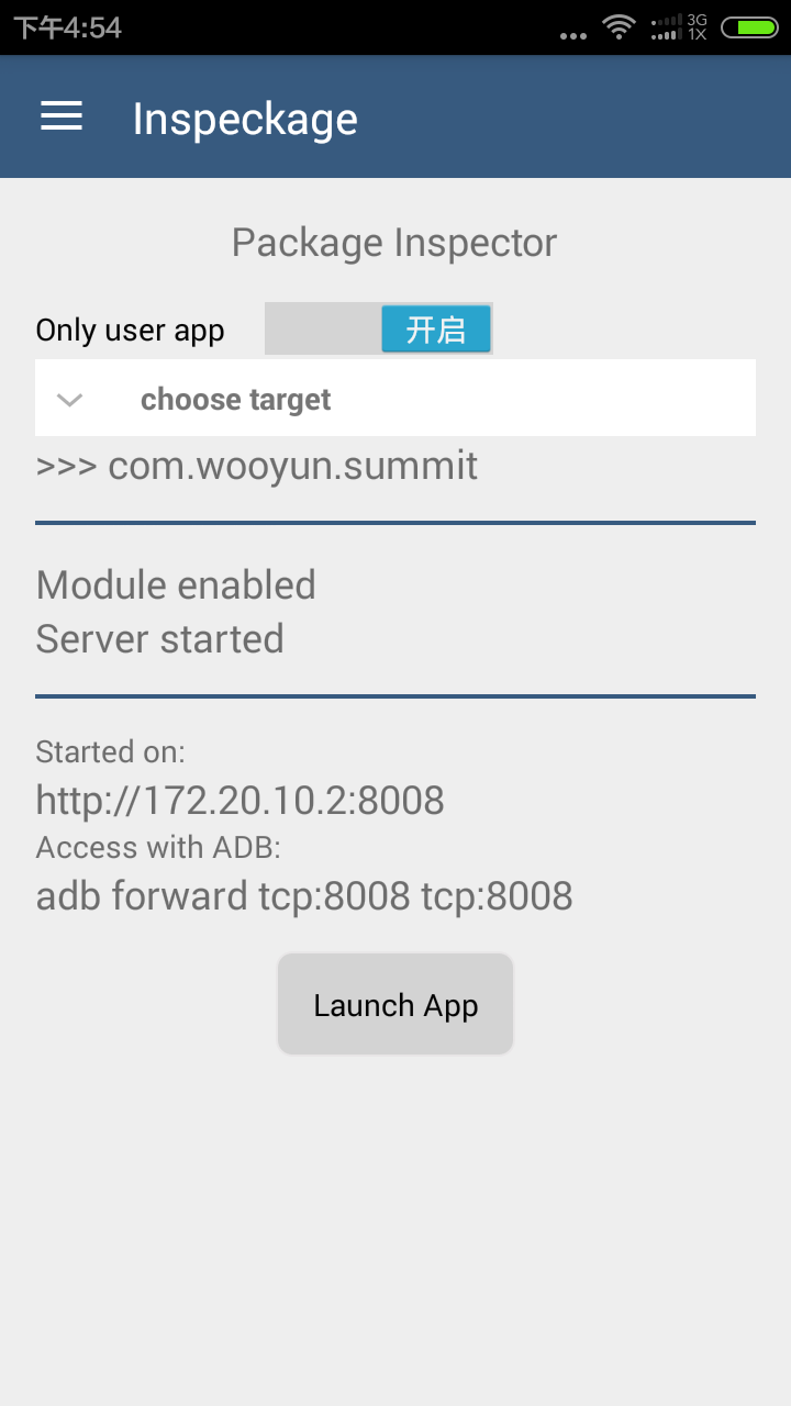 安装之后,可以在桌面上看到inspeckage的图标。点开之后主界面如下: