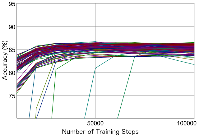 不同超参数下的英语分析模型的留存设定精度(held-out set accuracy,每条线对应一个设定了特定超参数的训练)。在一些情况下,训练是非常慢的,并且在许多情况下超参数的次优选择会明显降低精确度。我们发布的是我们所能为每种语言训练出的最佳模型。