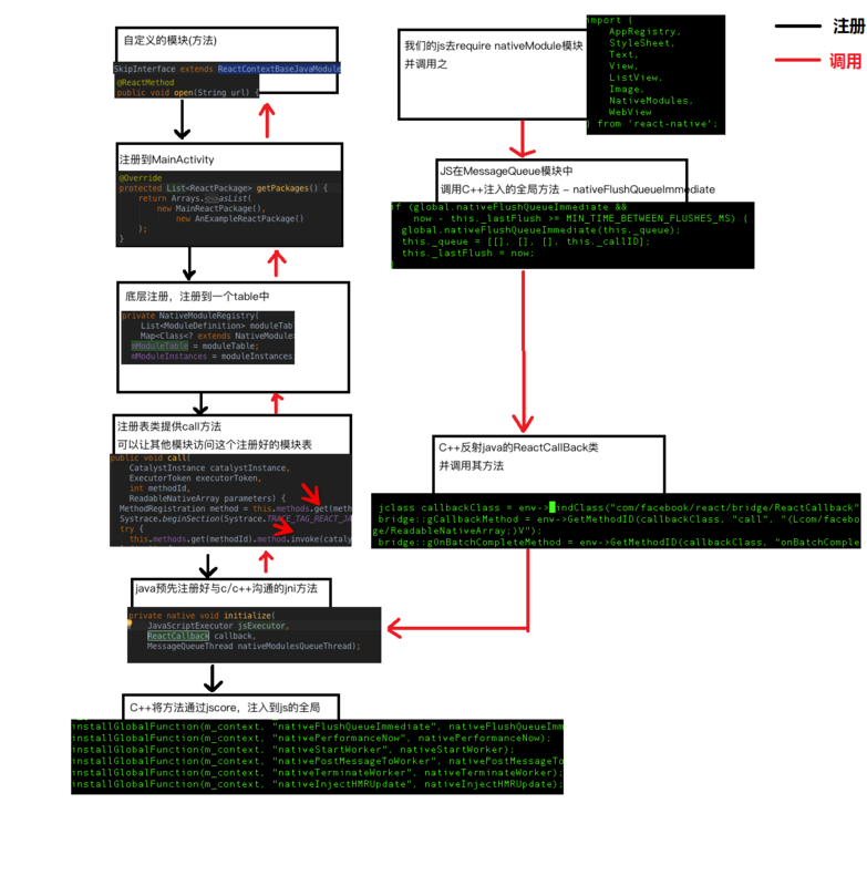 1.1 react-native 在java中注册的模块及其方法。 在初始化的时候,java通过JNI,注册统一方法到C++中。