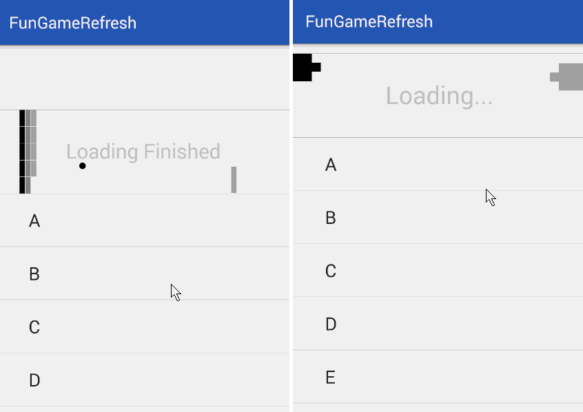 - 当后台线程没有执行完毕的时候,松开手指,下拉刷新控件会回滚到游戏区域高度的位置,用户任然可以继续玩游戏。