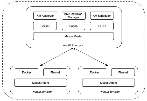 另外因为集群会有多个节点,开发者可能会修改部分源代码,为了在修改了源码之后,使修改可以快速便捷的在所有的机器上生效,我们将在wyq01.ibm.com这个机器上架设NFS服务,把它作为编译的机器,用来编译Mesos和kubernetes源代码。然后将编译的安装包目录 mount到其他的计算节点上。这样在修改了Mesos或者kubernetes的代码之后,只需要在wyq01.ibm.com进行编译然后只需要在另外两台计算节点上重启相应的服务就可以生效。