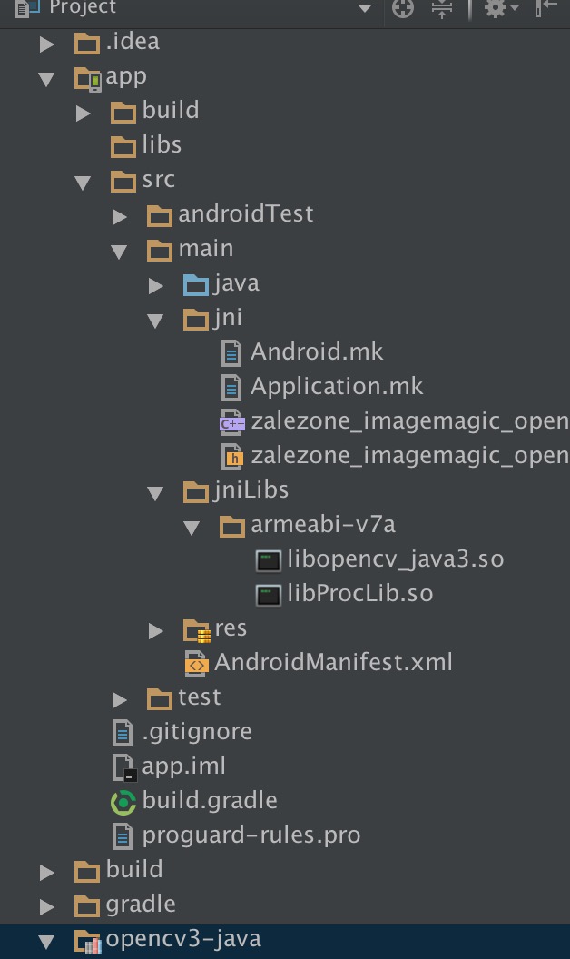 再新建一个jniLibs目录,用来存放cpp进行build完成以后的so文件,另外,需要将opencv中相应的libopencv-java3.so拷贝进来。在程序静态代码块中加载这个so文件和自己定义的so。