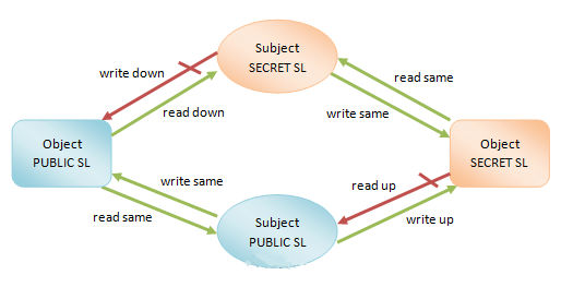 在多级安全中,主体和客体都有一个关联的安全级别,多级安全的访问规则就是:安全级别交高的主体可以读取安全级别较低的客体;而安全级别较低的主体可以写入安全级别较高的客体。前者称为 “read down”,后者称为 “write up”。通过这种规则,可以允许数据从安全级别较低的客体流向安全级别较高的主体,而限制数据从安全级别较高的客体流向安全级别较低的主体,从而有效的保护了数据。对于安全级别相同的主体和客体,主体对客体的读写都是允许的。