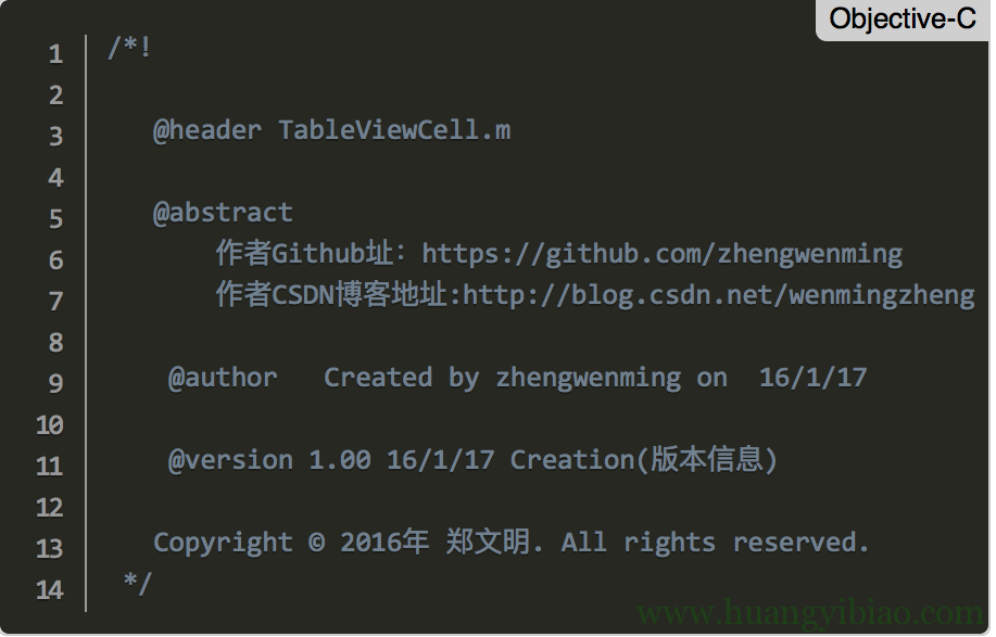 Xcode中自定义每个.h和.m中上部默认显示的信息,如公司,版本,作者,版权声明等。