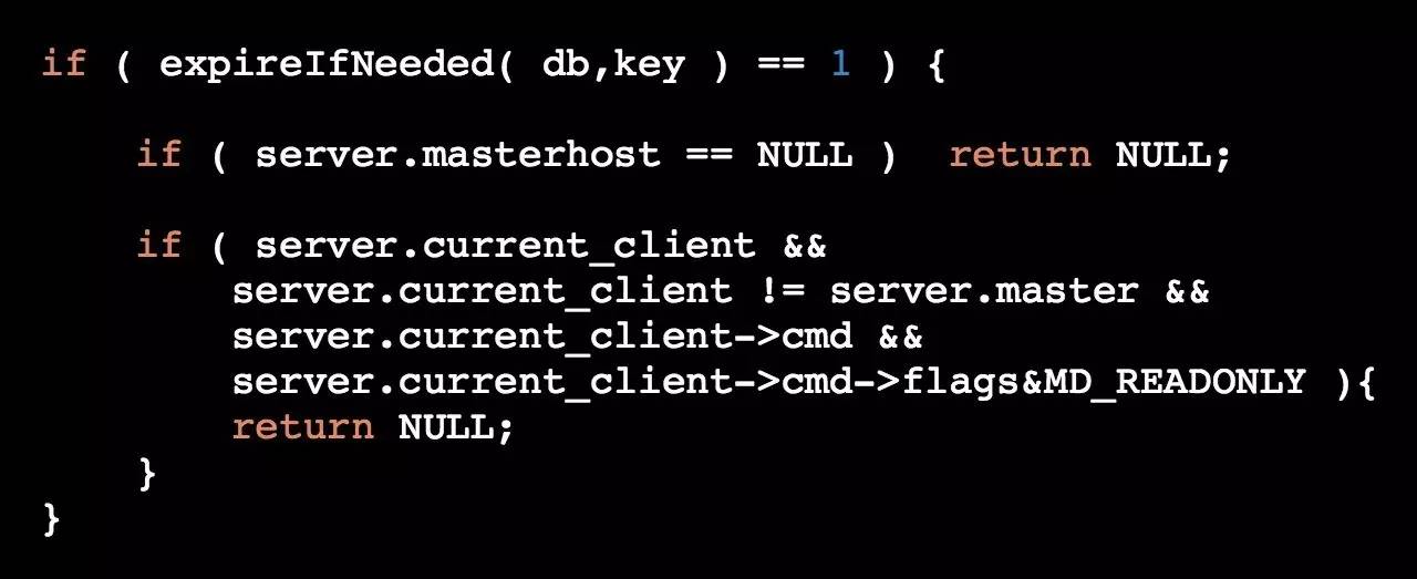 在redis 3.2-rc1版本中,redis加入了一个新特性来解决主从不一致导致读取到过期数据的问题(好吧,虽然这个新特性我们一直觉得是个bug fix),在源码db.c文件中,作者对lookupKeyRead做了相应的修改,增加了key是否过期以及对主从库的判断(代码如下),如果key已过期,当前访问的是master则返回null;当前访问的是从库,且执行的是只读命令也返回null(老版本从库真实的返回该操作的结果,如果该key过期后主库没有删除),源码片段如下: