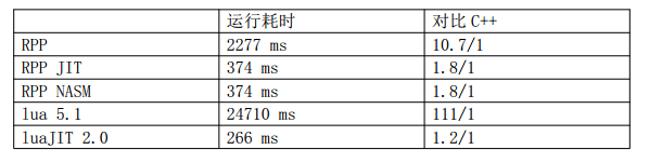 理由二:RPP以静态类型为主,没有GC,所以理论运行速度和C++一样,最终的效率肯定比动态类型的lua要高,并且不会引起GC停顿。(目前运行速度与luaJIT接近,比tcc略快)