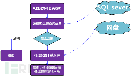 经过对木马加载器的详细分析和配置信息的猜测解读,做出如下图猜测,木马作者负责木马的免杀(同一个文件),并通过SQL Server上的配置信息来管理和销售木马,每卖出一个木马作者便为牧马人开立一个帐号,并新增一个ID与之对应,牧马人每次生成木马时会自动将配置信息上传到SQL Server上,包括木马的到期时间等内容则由作者直接配置。