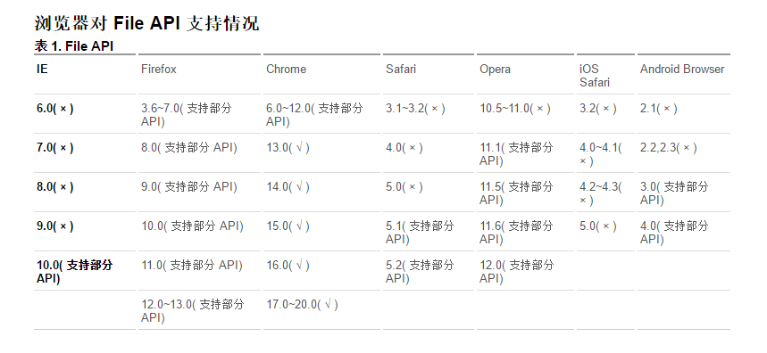 浏览器对 File API 支持情况的更详细信息可以参考网站 http://caniuse.com/#search=File 。