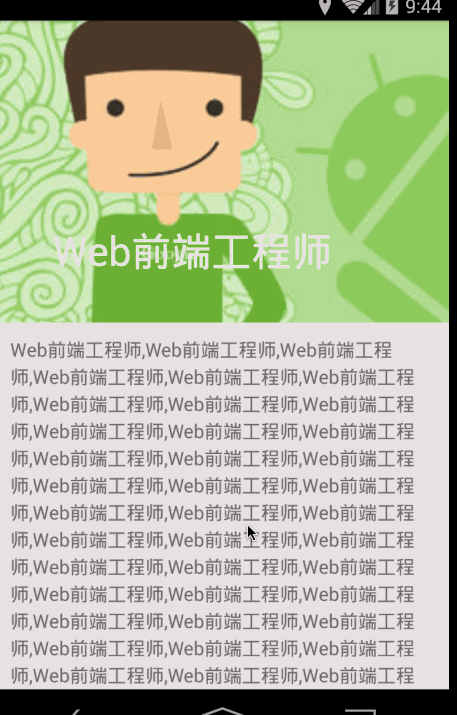 如果你从未听说过这两个类,没关系,听我慢慢介绍,你就明白这两个类可以用来干嘛了。相信大家都见识过或者使用过 CoordinatorLayout ,通过这个类可以非常便利的帮助我们完成一些炫丽的效果,例如下面这样的: