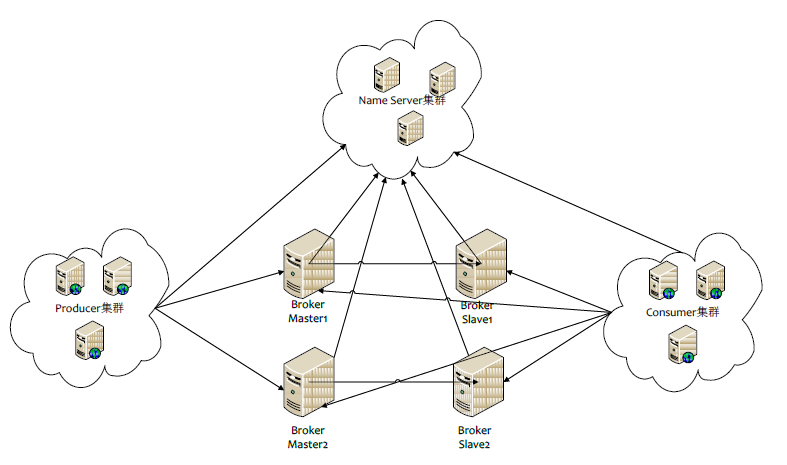 RocketMQ 的 Broker 有三种集群部署方式: 1. 单台 Master 部署; 2. 多台 Master 部署; 3. 多 Master 多 Slave 部署;采用第 3 种部署方式时, Master 和 Slave 可以采用同步复制和异步复制两种方式。下图是第 3 种部署方式的简单图: