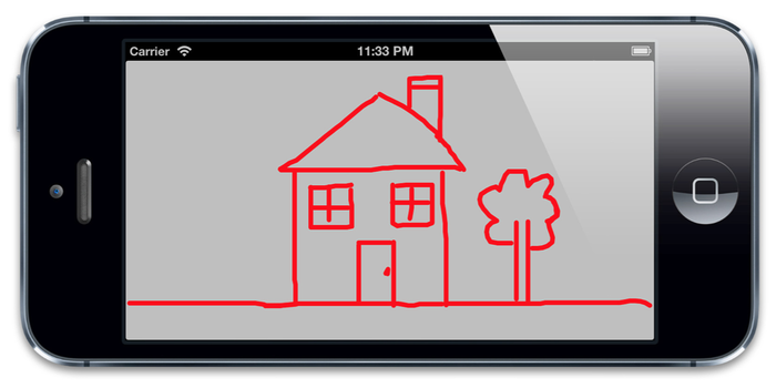 举个例子,清单13.1 展示了一个基本的画线应用。这个应用将用户的触摸手势转换成一个 UIBezierPath 上的点,然后绘制成视图。我们在一个 UIView 子类 DrawingView 中实现了所有的绘制逻辑,这个情况下我们没有用上view controller。但是如果你喜欢你可以在view controller中实现触摸事件处理。图13.1是代码运行结果。