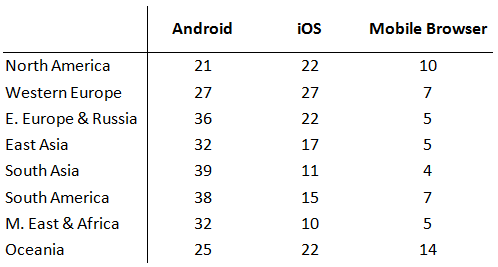 在谈及优先平台时,多年以来,iOS一直在开发者首选项里高居首位。一家公司在开始创建新的应用程序时,会把iOS作为第一个目标平台,而如果应用取得了成功,他们才会在Android上做同样的尝试。但现在,在北美和西欧,Android已经在开发者首选项里赶上了iOS。根据VisionMobile的调查,在世界的其他地区,Android也有重要的引领作用,尤其是在亚洲。下表给出了具体的数值。在业余和辅助项目里(这里没有给出),Android的数值比iOS高得更多。