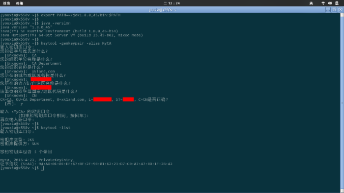 然后,再为我自己生成一个密钥对,使用命令 keytool -genkeypair -alias youxia 命令,按提示完成操作后,keystore 中就又多了一个 youxia 条目,如下图: