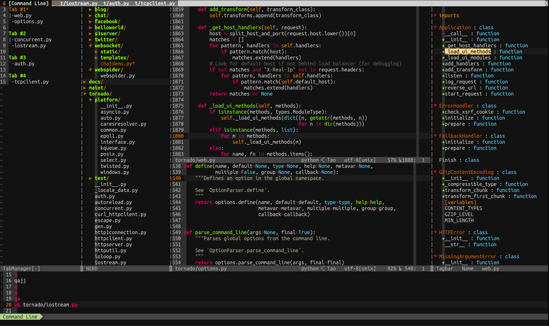 In this configuration,I use NERDTree as file browser. The NERDTree allows you to explore your filesystem and to open files and directory. It also allows you to hide files or set bookmarks etc. In NERDTree window input ? can get the opration guide. This configuration filters out .pyc , .git , .hg , .svn etc.