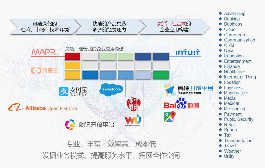 对服务提供方来说,如果想把API开放出来,需要持续对自身能力做分析和梳理,而且开放成API后,来自服务消费方的反馈也是非常直接的,有利于帮助企业思考自身的业务能力,到底什么东西最有价值,有助于发掘新的业务模式,提高服务水平。当把一个能力以API的形式开放出来后,由于消费的便捷和高效,更利于潜在客户的发掘和合作空间的拓展。我们需要这样一个产品,无论是跟已有系统的集成,还是把企业的能力开放出来给别人用,还是把企业内部各个系统之间以能力互通的方式去促进各个业务的创新和融合,都需要有一个能力的开放平台。