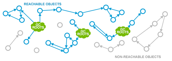 存活对象在上图中被标记为蓝色。当标记阶段完成了之后,所有的存活对象都已经被标记完了。其它的那些(上图中灰色的那些)也就是GC根对象不可达的对象,也就是说你的应用不会再用到它们了。这些就是垃圾对象,回收器将会在接下来的阶段中清除它们。