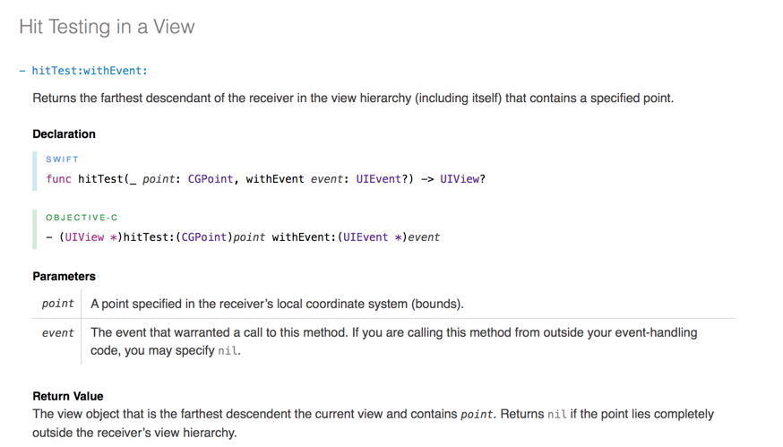 HitTest 会被频繁执行,你随便点击一个空白处,这个方法都会执行,这必然带来性能消耗,这也是 Apple 默认不使用这个方式的原因之一吧 HitTest 会使得我们的蓝色的 UIView 可以相应点击,但是它被点击的之后,执行的方法我们应该按常规的方式写(比如给它加一个 UIGestureRecognizer ,然后让这个 Gesture 有一个对应的 selector)。如果把需要执行的方法写在了 HitTest 里面,写在 return result 之前的话,我发现这些方法会多执行一次(在我当前写的这个简单 demo 里,我发现点击任意地方, HitTest 方法都会连续执行两次) 延伸阅读 - 深入浅出 iOS 事件机制