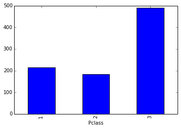 # 接下来我们对每个特征进行一下分析: train.groupby(['Pclass'])['PassengerId'].count().plot(kind='bar')