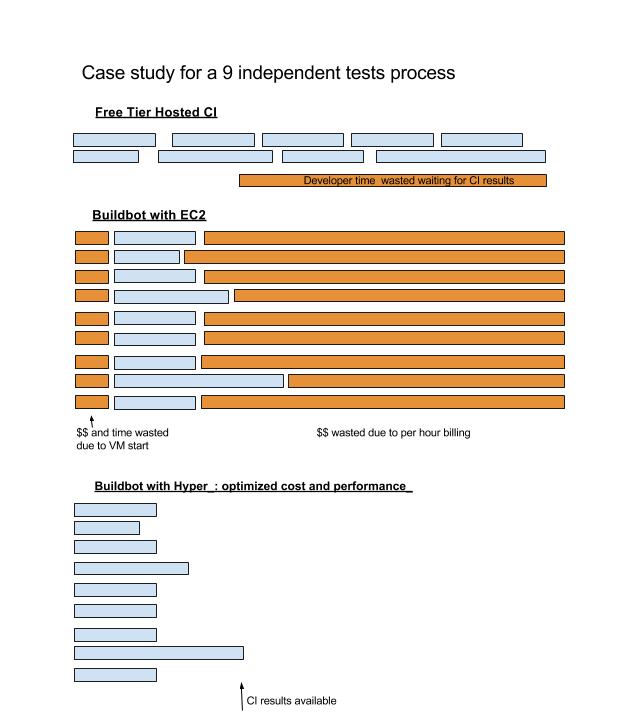 “Buildbot已经正式完成与Hyper_的集成,并将在10月中正式发布,同时Buildbot项目自身的所有build负载,也将全部迁移到Hyper_上”。Buildbot的Tech Lead表示。通过使用Hyper_,他们的build速度提高了16倍,而费用只是原来的1/10