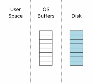 这里分了三个部分,左面是用户空间,中间是内核缓存区(文件的读写缓存),右边是物理磁盘设备(iOS的闪存)。在SQLite中数据最小的读写单位扇区(sector),通常是512B,图中每个小矩形代表一个扇区。蓝色代表未更改的原始数据,中间白色表示是空的,即此时数据没有读取到内核缓存区。