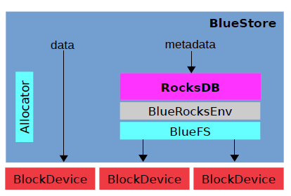 bluestore直接管理裸设备,抛弃了ext4/xfs等本地文件系统,BlockDevice实现在用户态下使用linux aio直接对裸设备进行I/O操作。既然是直接管理裸设备就必然需要进行裸设备的空间管理,对应的就是Allocator,目前支持StupidAllocator和BitmapAllocator两种分配器。相关的元数据以kv的形式保存到kv数据库里,默认使用的是rocksdb,由于rocksdb本身是基于文件系统的,不是直接操作裸设备,但是rocksdb也比较灵活,将系统相关的处理抽象成Env,用户可用实现相应的接口,rocksdb默认的Env是PosixEnv,直接对接本地文件系统,为此,bluestore实现了一个BlueRocksEnv,继承自EnvWrapper,来为rocksdb提供底层系统的封装,为了对接BlueRocksEnv,实现了一个小的文件系统BlueFS,只实现rocksdb Env需要的接口,在系统启动mount这个文件系统的时候将所有的元数据都加载到内存中,BluesFS的数据和日志文件都通过BlockDevice保存到裸设备上,BlueFS和BlueStore可以共享裸设备,也可以分别指定不同的设备。