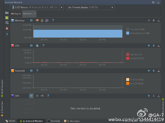 但为了解决内存泄漏,我们首先必须要能够找到它。幸运的是, Android Studio 有一个叫做 Android Monitor 的内置工具,我们可以用它来 观察除应用内存使用情况。我们需要做的仅仅是打开Android Monitor 并转到对应tab,看看使用了多少内存和内存实时分配情况。