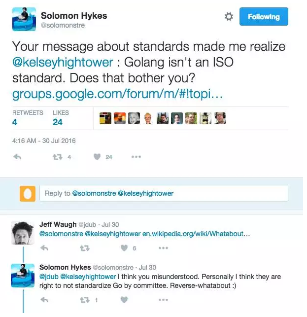Kelsey 率先在 Twitter 上@了 Solomon 关于 Docker 不是行业标准的文章,接下来 Solomon 在Twitter上回复了Kelsey,两人在评论区的言论十分精彩。