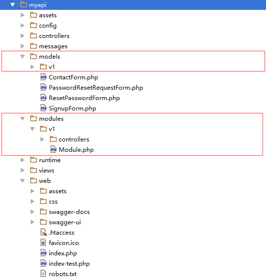 注: 本例中models均放在myapi/models/v1下,也可以直接将models放在myapi/modules/v1/models下