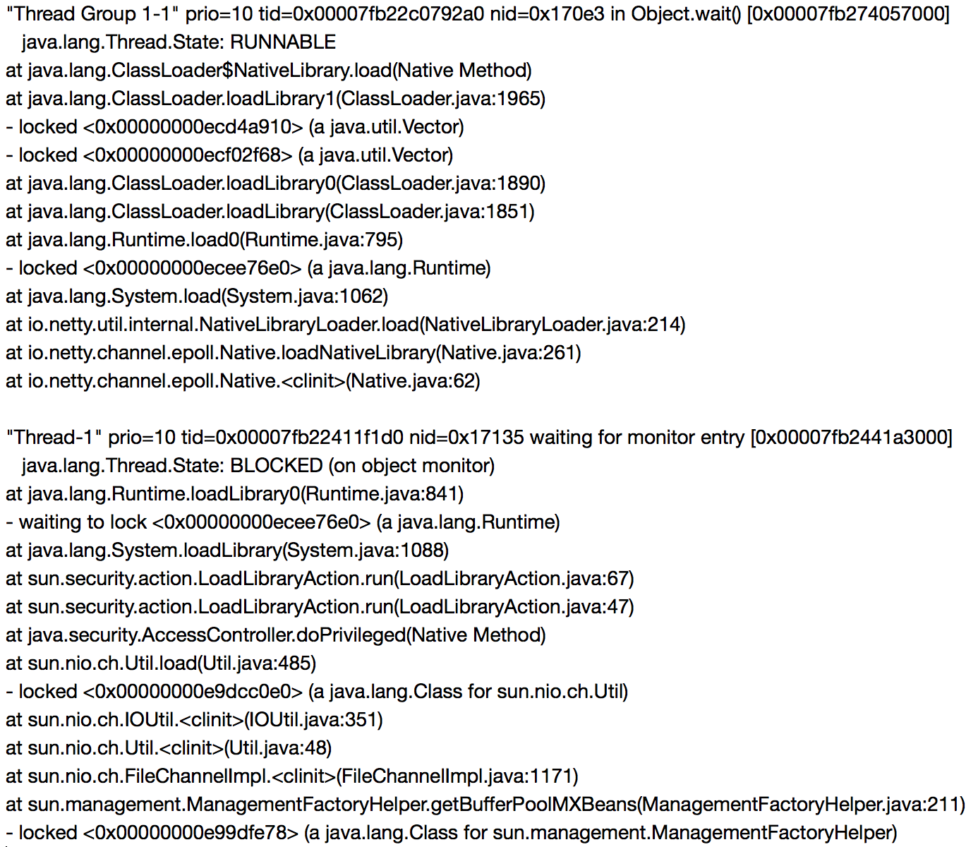 第一时间jstack,得到如下输出,看到Netty在加载Native库时, Object.wait() [0x00007fb274057000]被锁住了。但因为已经进入Native部分,所以线程还是显示Runnable。 同时,有一个在JMX里注册Metrics的线程成为了受害者,Netty的线程锁住了它所需要的”java.lang.Runtime<0x00000000ecee76e0>"