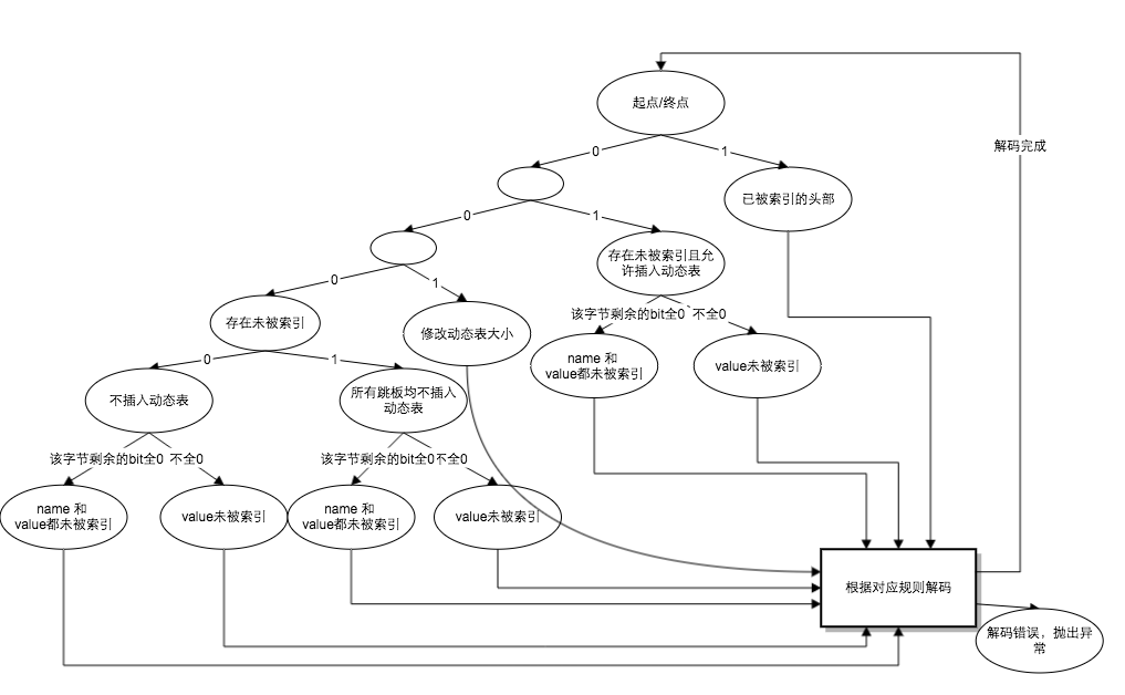 我们都知道,想要正确无误的解码,每个编码都要满足一个条件,就是每种编码方式,都不是另外一个编码的前缀。这里的 HPACK 的编码的最小单位是字节。我们看一下整个二进制流解码的状态机:
