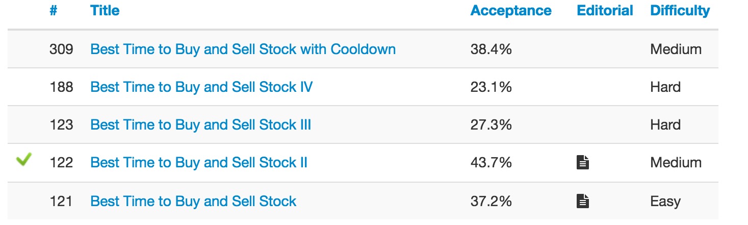 Leetcode上有五道关于股票买卖相关的问题,恰巧笔者面试阿里的时候也被问及,因此在本文中略作总结,这五个问题列举如下: