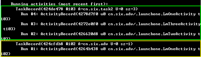 Task #103 : affinity = “cn.six.task2”, size = 3 (它里面有三个activity)