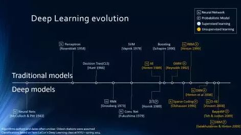 在计算能力变得日益廉价的今天,深度学习试图建立大得多也复杂得多的神经网络,我们可以把算法理解为深度学习的神经网络或是计算思维,这种神经网络越复杂,捕捉到的信号就越精确,目前比较常见的算法包括 深度信念网络(Deep Belief Networks)、卷积神经网络(ConvolutionalNeural Networks)、受限玻尔兹曼机(Restricted BoltzmannMachine)和堆栈式自动编码器(Stacked Auto-encoders) ,以深度卷积神经网络为代表的监督学习方法目前来说是最有效也是使用最多的。