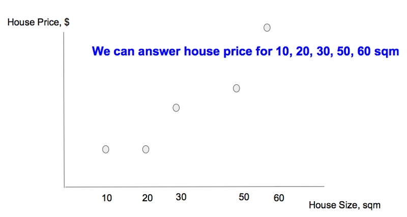 我们从一组收集到的数据点开始(见下图),每个数据点代表两个值之间的关系——输出(房价)与影响因素(房子面积)。