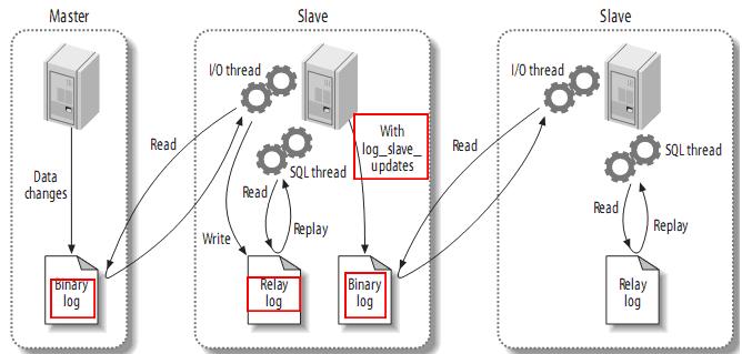 当设置log_slave_updates时,你可以让slave扮演其它slave的master。此时,slave把SQL线程执行的事件写进行自己的二进制日志(binary log),然后,它的slave可以获取这些事件并执行它。如下: