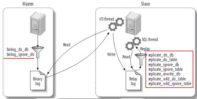 复制过滤可以让你只复制服务器中的一部分数据,有两种复制过滤:在master上过滤二进制日志中的事件;在slave上过滤中继日志中的事件。如下:
