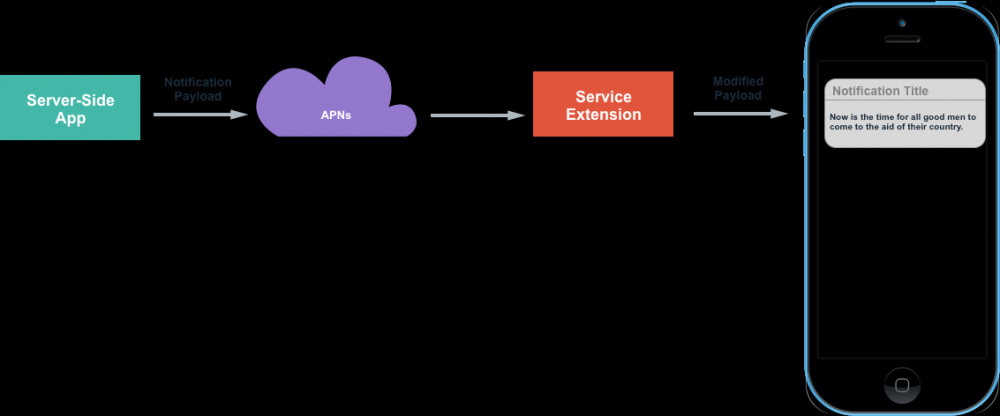 从这张图上,我们可以看到,原先直接从APNs推送到用户手机的消息,中间添加了ServiceExtension处理的一个步骤(当然你也可以不处理),通过这个ServiceExtension,我们可以把即将给用户展示的通知内容,做各种自定义的处理,最终,给用户呈现一个更为丰富的通知,当然,如果网络不好,或者附件过大,可能在给定的时间内,我们没能将通知重新编辑,那么,则会显示发过来的原版通知内容。
