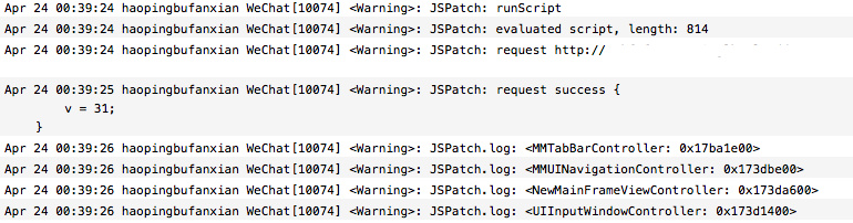 因为微信自带了 JSPatch 所以启动的时候会报 Warning ,说有两个 JPEngine,不用管。
