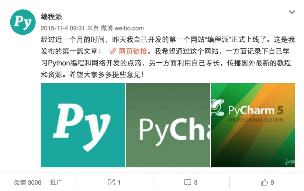 去年 11 月 4 日,更新第一篇文章后发的微博。