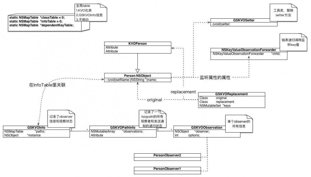 这个部分就是观察者的注册了。通过以下类图可以很方便得看到,所有的类的KVO观察都是通过infoTable管理的。以被观察对象实例作key,GSKVOInfo对象为value的形式保存在infoTable表里,每个被观察者实例会对应多个keypath,每个keypath会对应多个observer对象。顺带提一下,关于Notification的实现也类似,也是全局表维护通知的注册监听者和通知名。