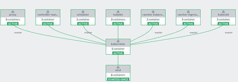 在Rancher中,由于Kubernetes是基于Cattle引擎来部署,所以在Kubernetes部署完成之后,我们可以通过Link Graph来很清晰地看到整体的部署情况。