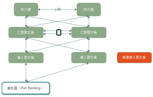 某年某月某日,机房上架新的服务器。我们的架构是服务器上联两台接入层交换,做端口bonding。每两个机柜都会有接入层交换机,所有接入层交换,双链路上联到汇聚层交换中。然后,汇聚层交换运行MSTP+HSRP协议。架构图如下:我们的操作是要新增一个接入层交换,用来扩展网络规模。