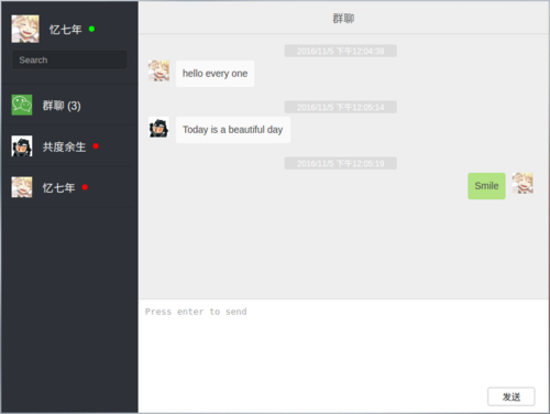 这是一个 Web 版的聊天应用,前端基于 Vue 来构建,用 Vuex 来进行状态管理, webpack 构建;服务端通过 Swoole 来实现。基本功能有单聊、群聊、用户状态、消息状态以及通知信息。