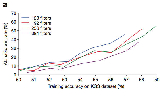 有意思的是在AlphaGo为了速度上的考虑,只用了宽度为192的网络,而并没有使用最好的宽度为384的网络(见图2(a)),所以要是GPU更快一点(或者更多一点),AlphaGo肯定是会变得更强的。