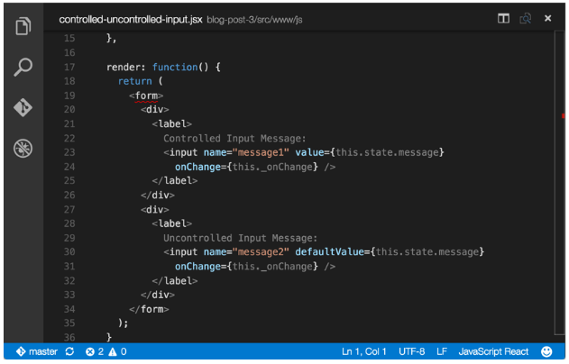 在第一个输入框中输入文本,可以观察到只有第一个输入框有更新。因为第二个输入框没有绑定 value 属性,当 message 更新的时候,并不会影响到第二个输入框。第二个输入框通过 onChange 属性处理 change 事件,当 state 更新,message 值更新到第一个输入框,然后显示在屏幕上。第二个输入框的 defaultValue 属性只在输入组件首次渲染的时候会用到。